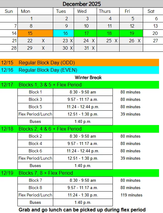 Monday 12/15, and Tuesday 12/16 are regular full days of school. The final three days of the semester will be on a shortened schedule. Please note the dates and times...