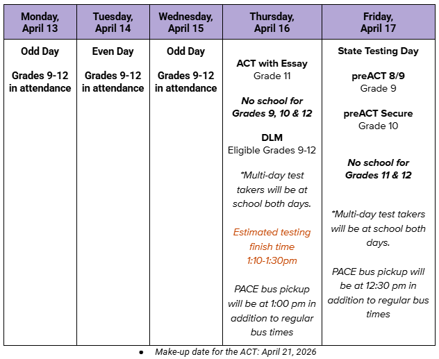 School will run on a regular schedule on Monday through Wednesday. Students and parents will receive emails with information about the date (Thursday and/or Friday) and location of their test session. The ACT or preACT for all grades will be administered electronically on the students’ school-issued Chromebooks. Spring assessments will be around 3 to 4 hours long including breaks. The length of testing for students testing with accommodations will vary by accommodation.